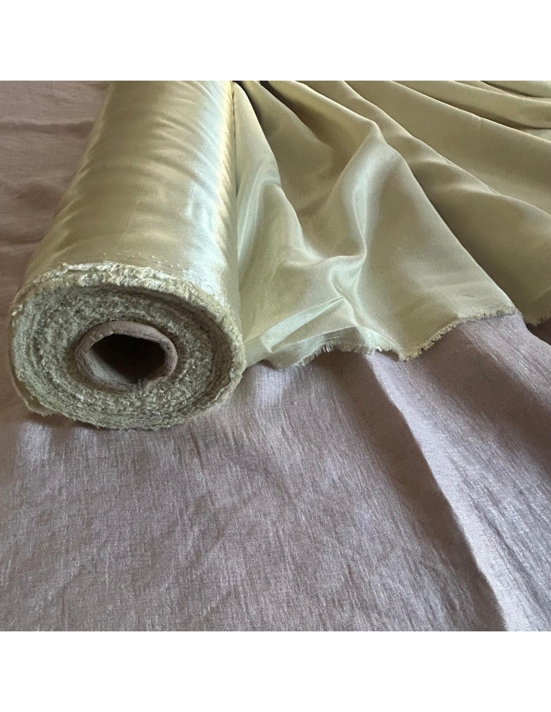 Tkanina inspirowana jedwabiem szantungowym w odcieniu coś pomiędzy groszkowym ,limonkowym, pistacjowym.